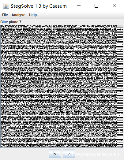 打开 StegSolve 查看不同 plane 下的图片,发现 BluePlane7 有异样,形成了鲜明的行分层