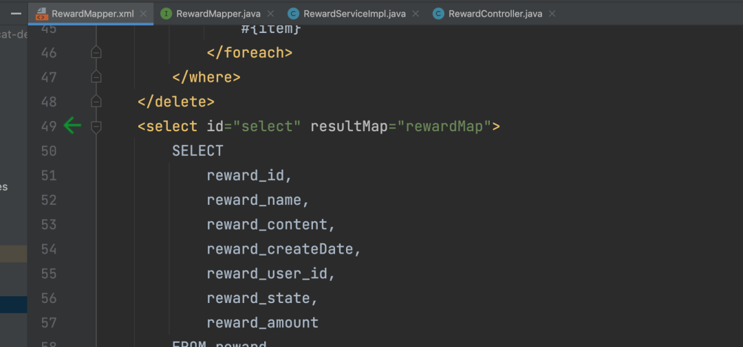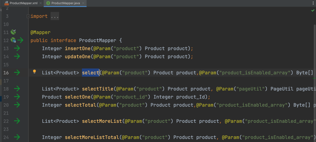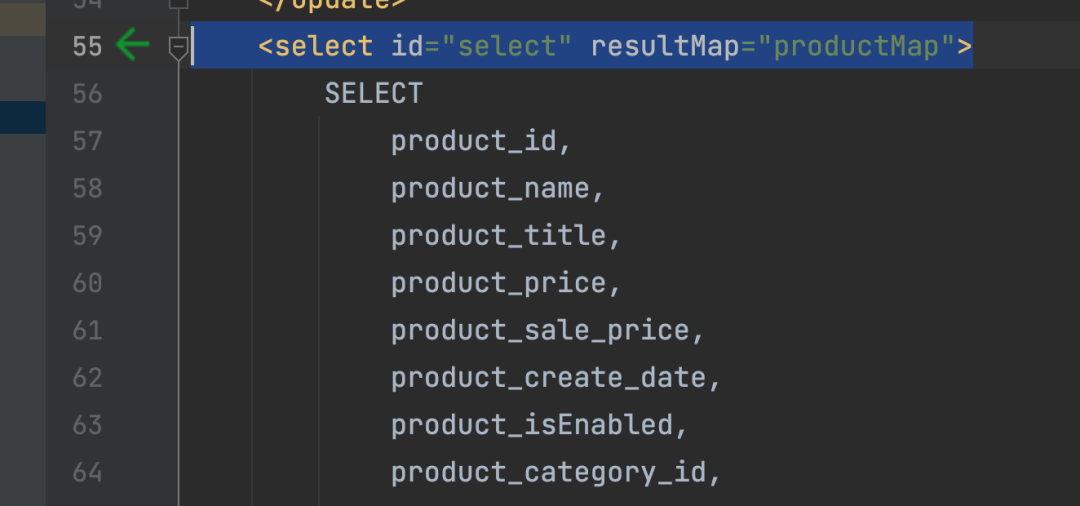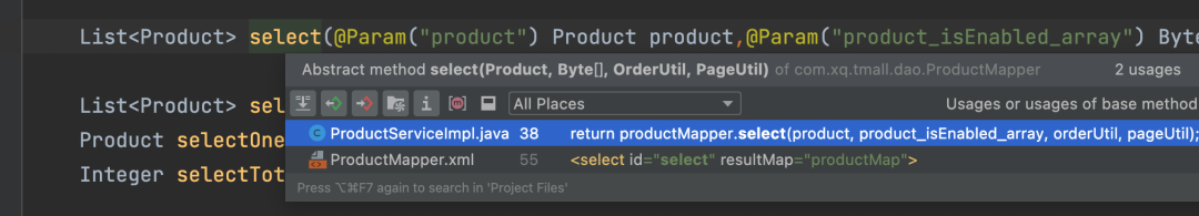 上面图片中,88为变量所在行数,向上寻找select参数,发现是在55行,点击箭头,即可跳转到对应的接口类。