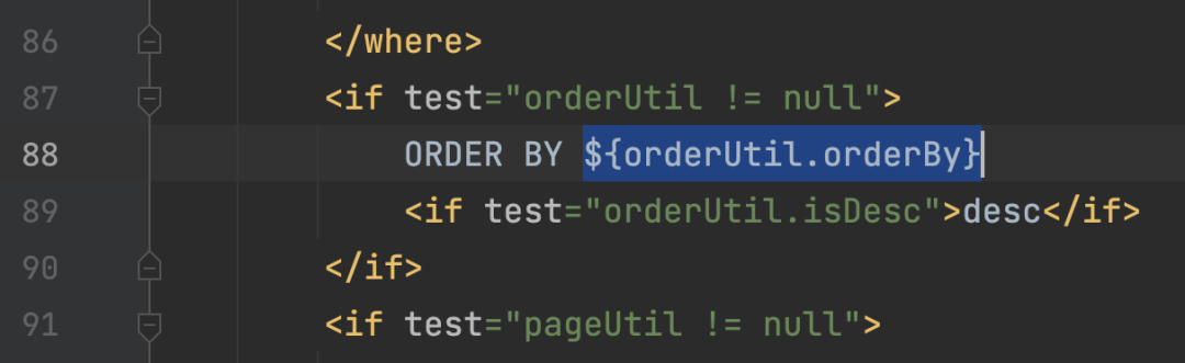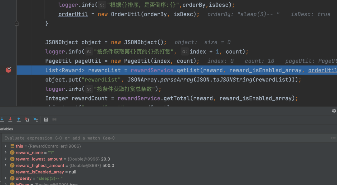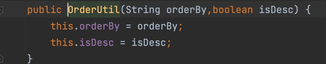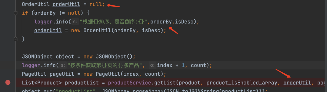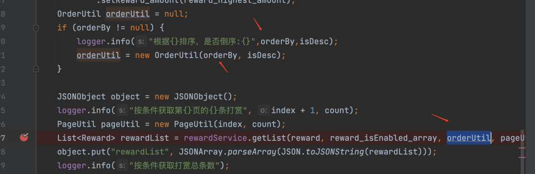 然后orderutil默认null,判断orderby是否为空,不为空则执行打印,然后吧数据带入到orderutil,再然后带入断点的地方: