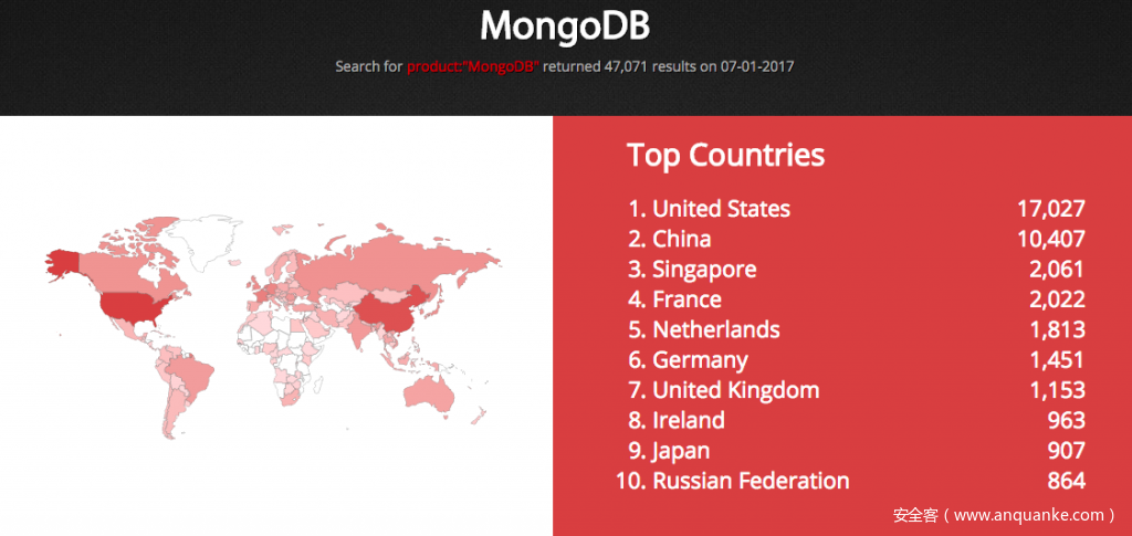 针对MongoDB的勒索中,通过当时Shodan网络空间搜索引擎得到的数据和显示:2017年初的勒索事件有近3W台MongoDB服务器受到影响。