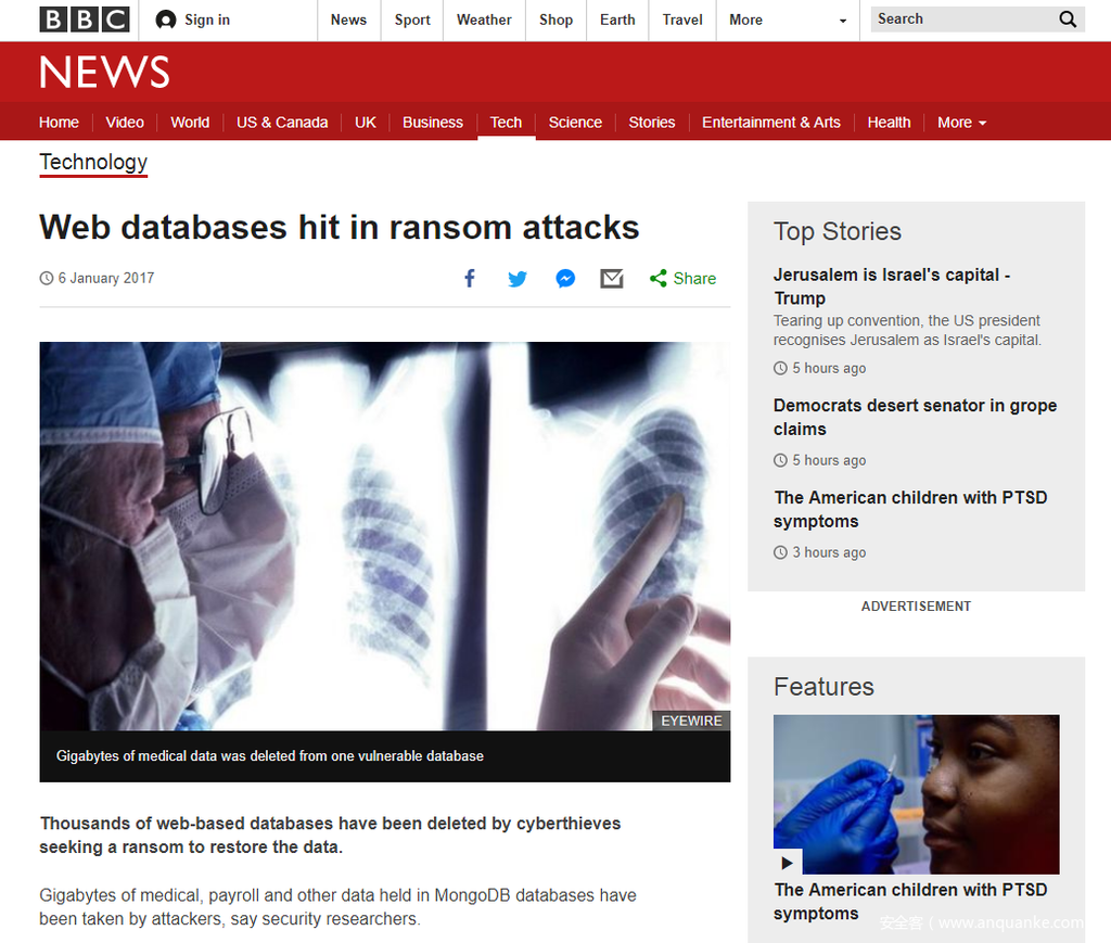 2016年12月末至2017年1月初,国外部分用户发现自己MongoDB数据库的数据被黑客删除并发推引起了互联网的注意。黑客把数据库里的数据都删除了,并留下一张“warning”的表,里面写着如果想“赎”回数据,就给0.2比特币(约等于200$)到某比特币账户地址。