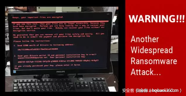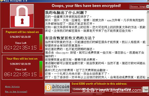 2017年5月,360互联网安全中心发现全球多个国家和地区的机构及个人电脑遭受到了一款新型勒索软件攻击,并于国内率先发布紧急预警,外媒和多家安全公司将该病毒命名为“WanaCrypt0r”(直译:“想哭勒索蠕虫”)