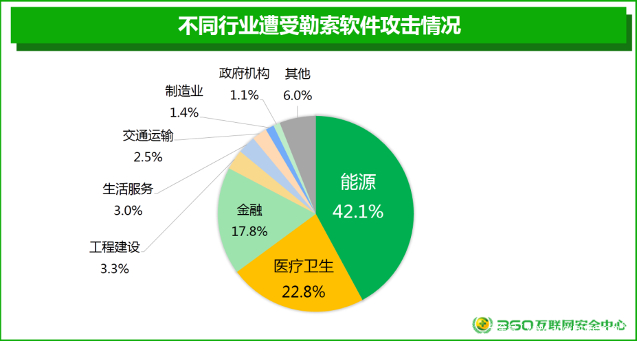 不同行业政企机构遭受勒索软件攻击的情况分析显示,能源行业是遭受攻击最多的行业,占比为42.1%,其次为医疗行业为22.8%,金融行业为17.8%,具体分布如下图所示。需要说明的是,遭到攻击多不代表被感染的设备多。攻击量是通过企业级终端安全软件的监测获得的。