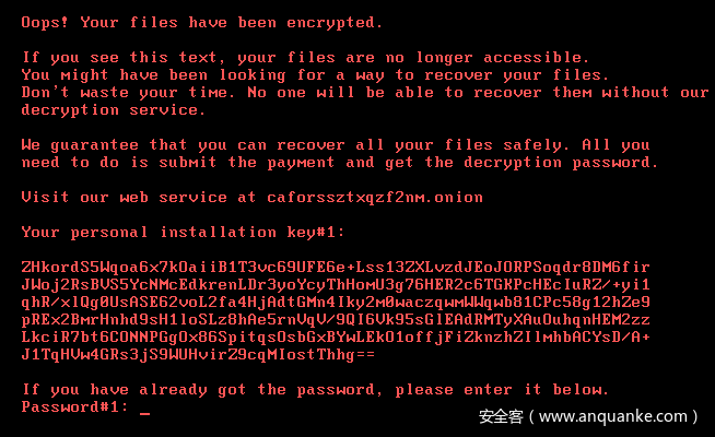 而除了传统的加密文件之外,该木马还会创建一个名为dispci.exe的程序,而这个dispci.exe在重启之后会创建一个名为cscc.dat的驱动程序并与之通信,驱动的功能则和之前提到曾大规模爆发的Petya相似——通过修改MBR的方式劫持开机启动。感染成功后的logo: