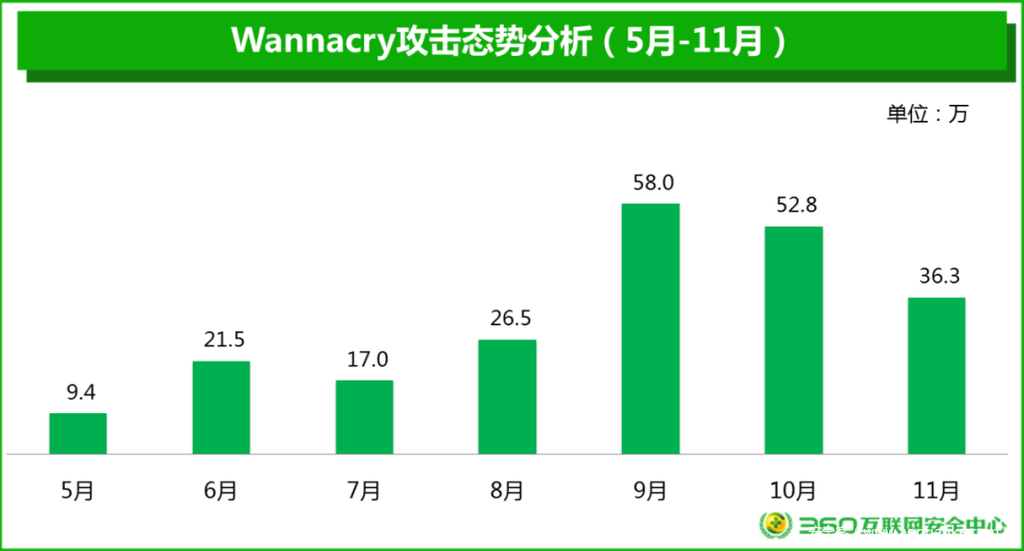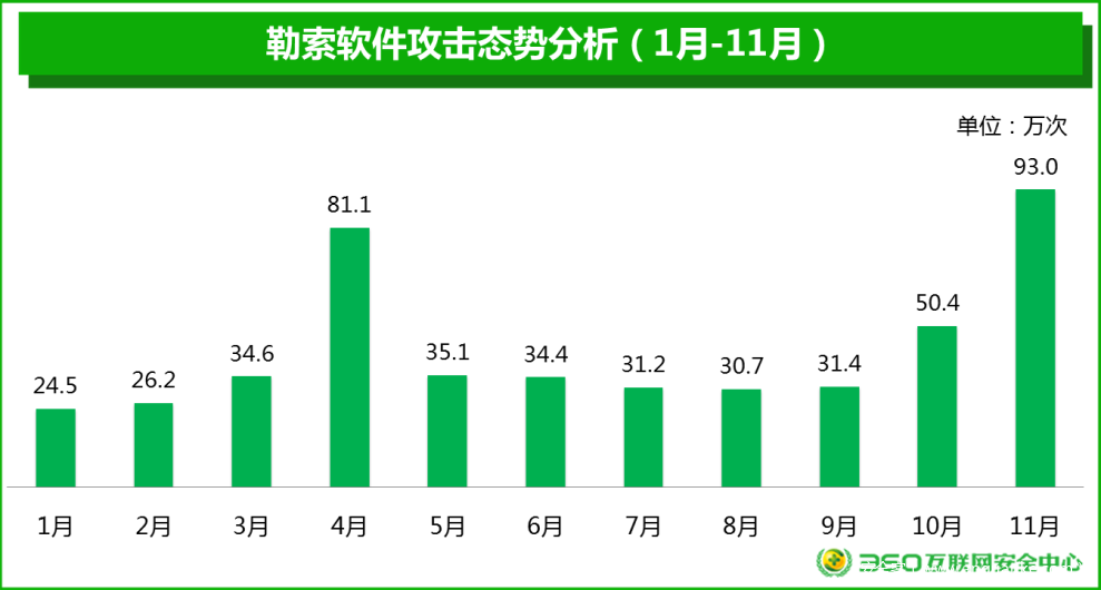 2017年1-11月,360互联网安全中心共截获电脑端新增勒索软件变种183种,新增控制域名238个。全国至少有472.5多万台用户电脑遭到了勒索软件攻击,平均每天约有1.4万台国内电脑遭到勒索软件攻击。