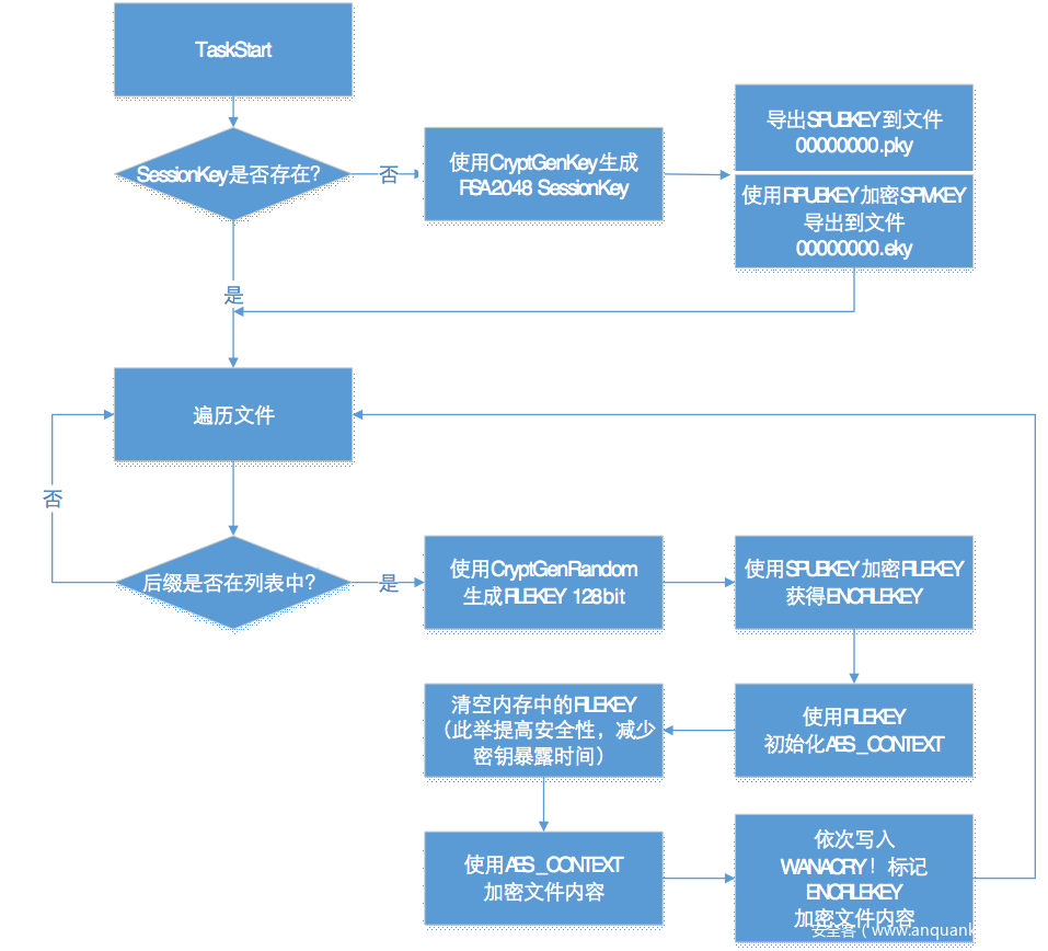 蠕虫会释放一个加密模块到内存,动态获取了文件系统和加密相关的API函数,以此来躲避静态查杀,整个加密过程采用RSA+AES的方式完成,其中RSA加密过程使用了微软的CryptAPI,AES代码静态编译到dll。加密流程如下图所示: