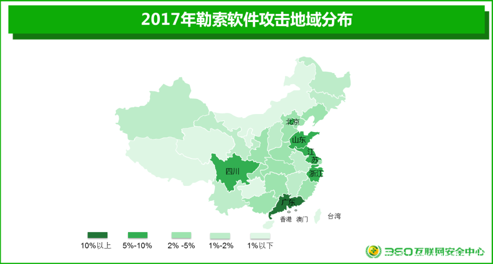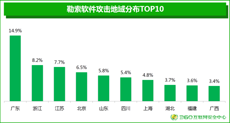 360互联网安全中心监测显示,遭遇勒索软件攻击的国内电脑用户遍布全国所有省份。其中,广东占比最高,为14.9%,其次是浙江8.2%,江苏7.7%。排名前十省份占国内所有被攻击总量的64.1%。