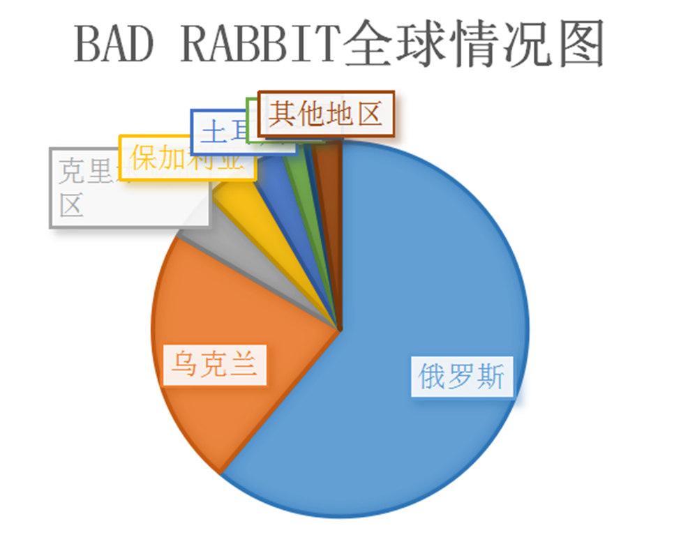 根据监测,中国地区基本不受“坏兔子”勒索病毒影响。“坏兔子”勒索蠕虫虽然在传播范围上不及WannaCry,但在内部实现上却可以看出比之前WannaCry和Petya更为缜密,病毒作者在设计上是取其前者的优点并避开不足之处,同时也采用了前者没有利用的水坑攻击方式。