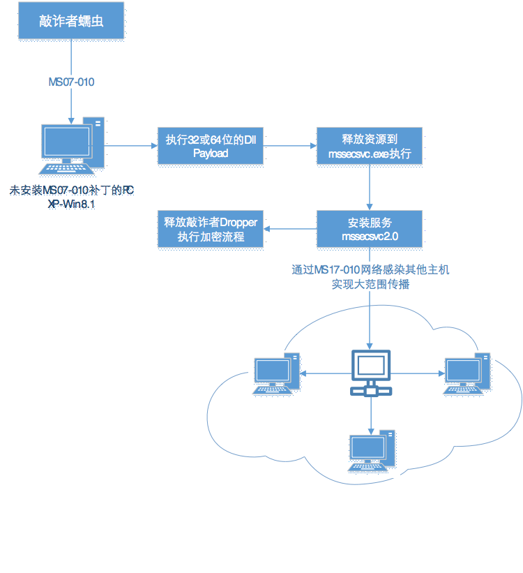 通过对其中的发送的SMB包进行分析,发现其使用漏洞攻击代码和https://github.com/rapid7/metasploit-framework近乎一致(为Eternalblue工具使用的攻击包),该蠕虫病毒使用了ms17-010漏洞进行了传播,一旦某台电脑中招,相邻的存在漏洞的网络主机都会被其主动攻击,整个网络都可能被感染该蠕虫病毒,受害感染主机数量最终将呈几何级的增长。其完整攻击流程如下: