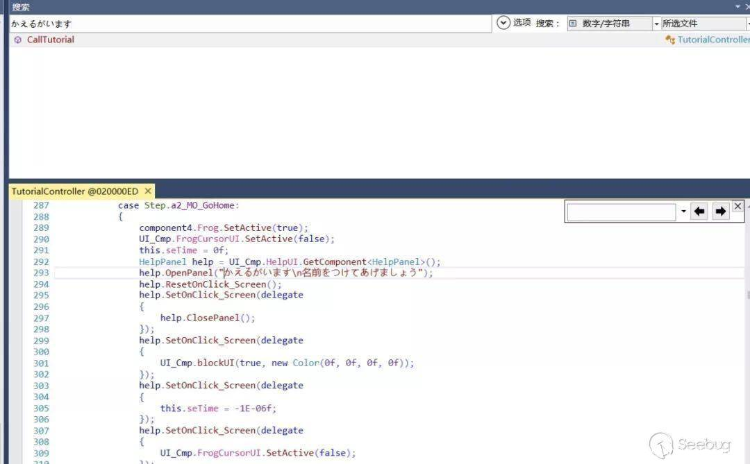 然后就是进行汉化了。汉化的方法和上面的类似。首先搜索需要修改的文字。例如给小青蛙起名字的时候。直接进行字符串搜索。