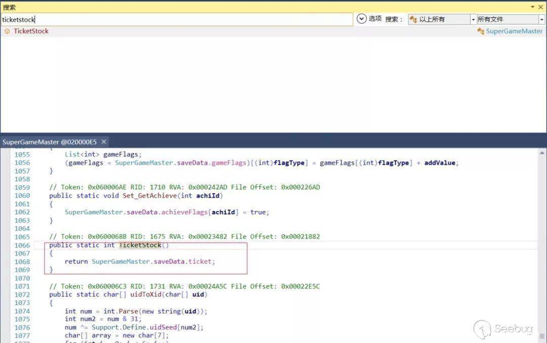 已知抽奖的时候奖券是从SuperGameMaster.TicketStock()获取的,找到该方法。令其返回值为固定的数值。