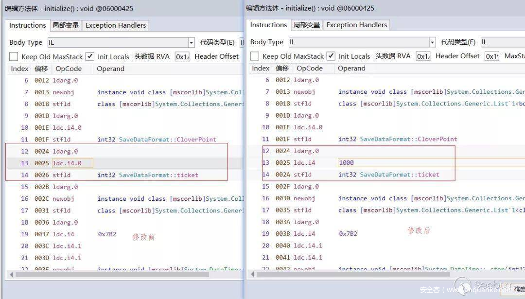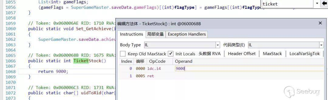 快捷键Ctrl+E编辑IL指令。找到ticket变量后,将ldc.i4.0改为ldc.i4,然后将数值改为1000.
