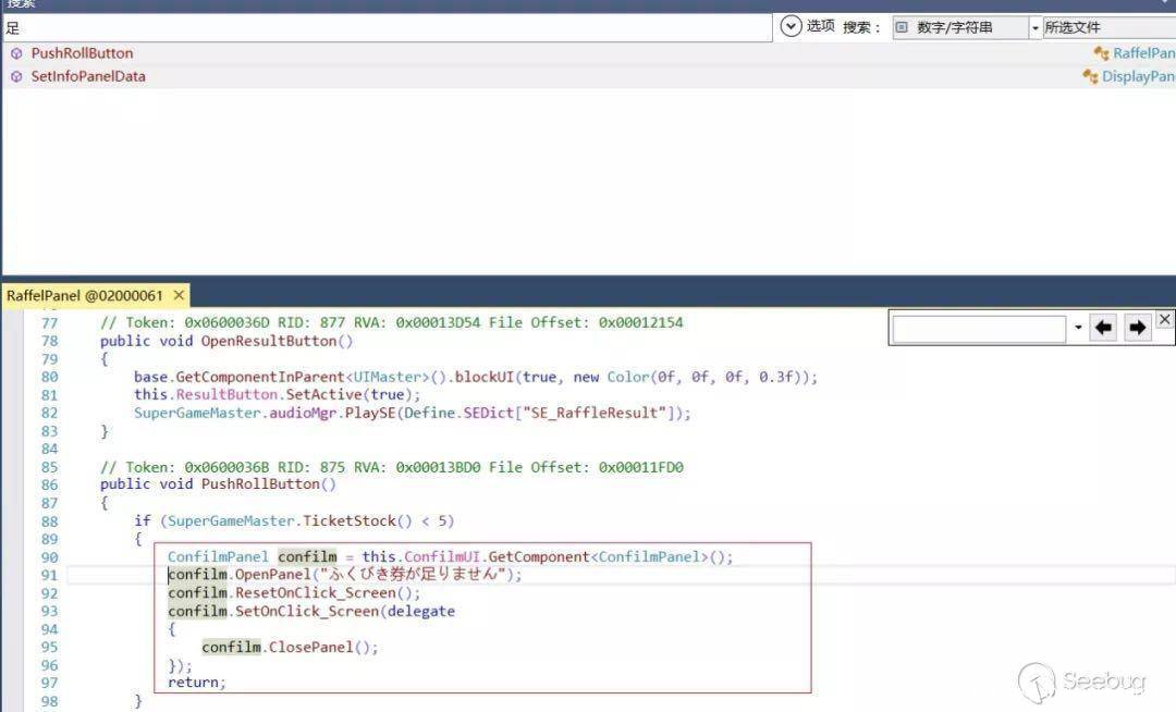 使用dnSpy打开Assembly-CSharp.dll文件,然后搜索字符串”足”,可以发现有两个,打开后发现是第一个。