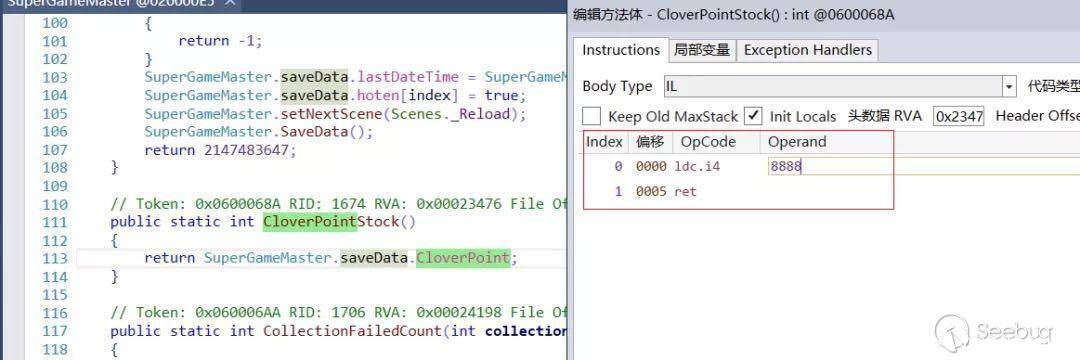 另一个就是修改三叶草的数量了。三叶草是该游戏中流行的货币,买东西都是需要该物品。同理找到CloverPointStock()方法。