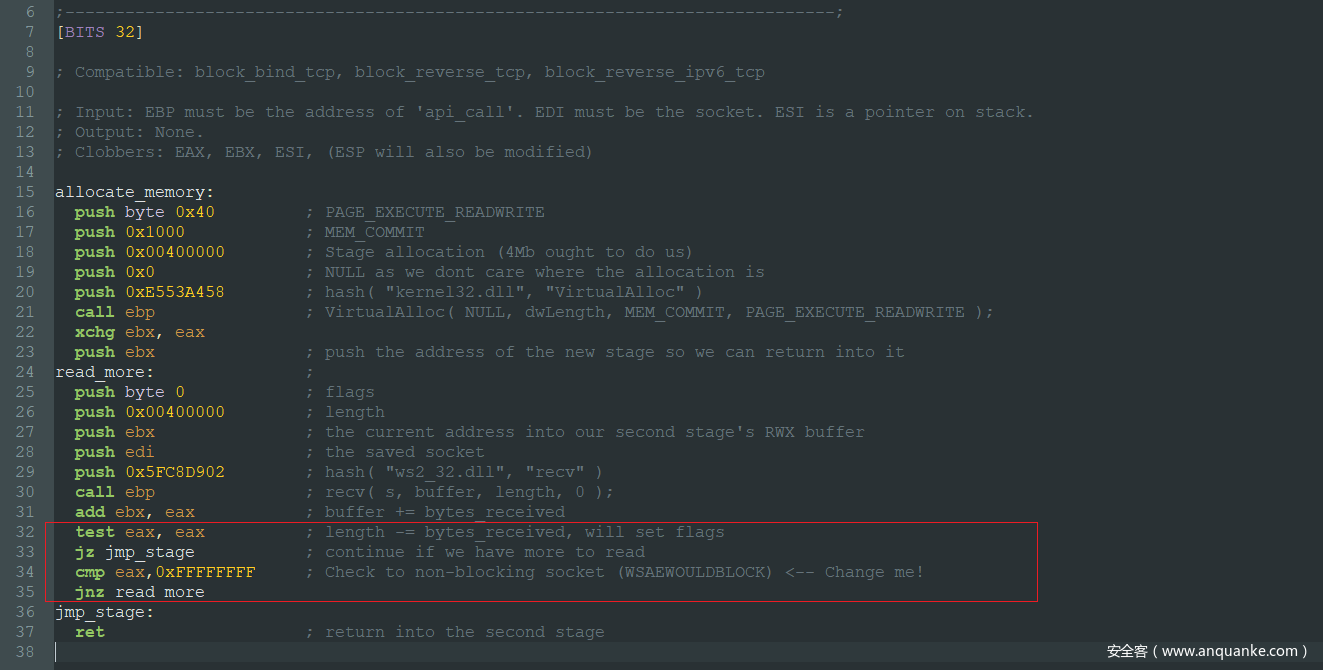 因此,我们只需要知道用来收集存在漏洞的命令(这里为CWD)的缓冲区大小,以便调整偏移量。当stager找到socket句柄时,就会执行如下代码。这里我没有发送payload的大小,而是直接调用VirtualAlloc来保留一个足够大的缓冲区(4MB)。之所以在eax等于FFFFFFF时停止接收数据,是因为这种情况下socket为非阻塞(non-blocking)状态,如果无法从缓冲区中获取更多数据,那么就会返回WSAEWOULDBLOCK。这种方式不是特别稳定,可以添加更多逻辑(如添加GetLastError API),但作为PoC来说这样处理已经足够。