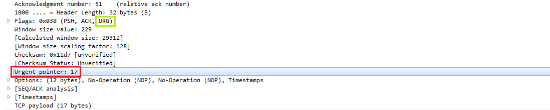 我们可以在send函数中通过MSG_OOB标志发送OOB数据。当使用这种方式时,TCP栈会构造带有URG标志的一个数据包,将OOB数据所在的偏移地址填充到Urgent Pointer中。