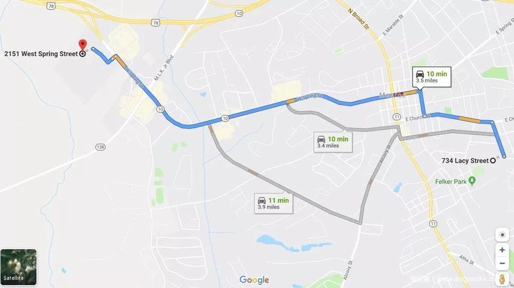 在本案例中,距离目标3.5英里远——西春街 2151号 (2151 West Spring Street)。