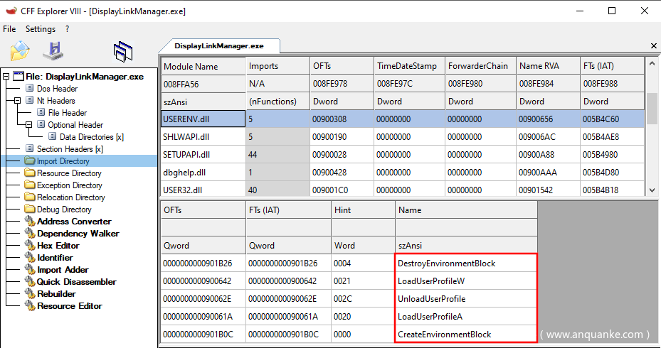 为了创建恶意DLL,我们首先来看看Display Manager从USERENV.dll导入的函数。为此,我将使用CFF Explorer。