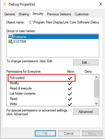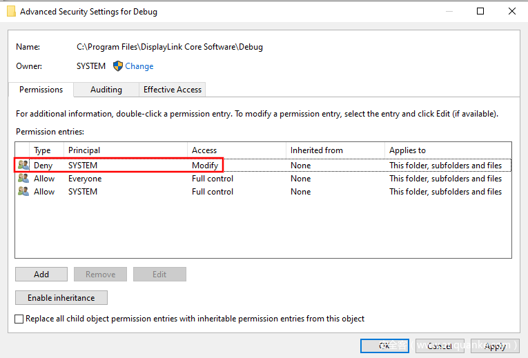 1、修改C:Program FilesDisplayLink Core SoftwareDebug的ACL,禁用SYSTEM的修改权限;