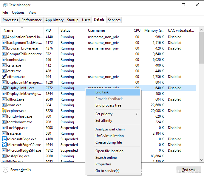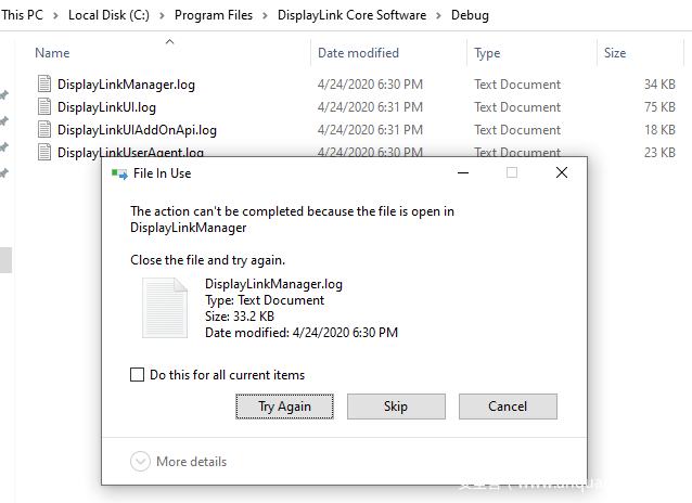 由于DisplayLink UI Systray应用程序打开了DisplayLinkUI.log和DisplayLinkUIAddOnApi.log,该应用程序以当前用户的权限运行,因此我们可以在任务管理器中将其关闭,然后删除日志文件。