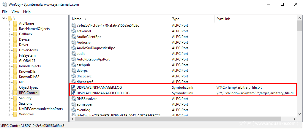 我们查看在RPC Control中创建的对象,可以看到我们的“日志文件”。为此,我们使用Sysinternals Suite中的WinObj.exe。