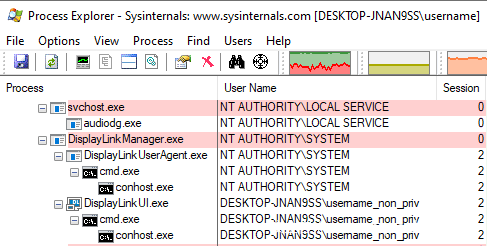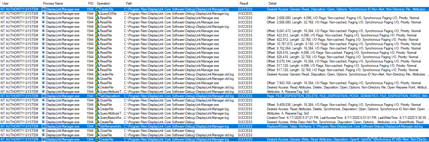尽管我们可以完全控制文件夹及内容,但是由于日志文件是由DisplayLink Manager进程打开的,因此无法删除这些内容。并且,我们无法停止DisplayLink Manager进程,因为它们是以SYSTEM身份运行,而我们仅仅是普通用户的权限。
