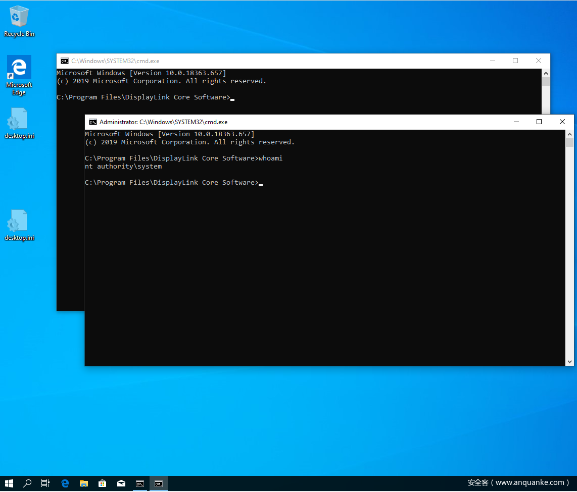 至此,我们就获得了SYSTEM Shell。在这里,我们可以看到实际弹出了两个cmd.exe Shell,这是因为我们的恶意DLL是由DisplayLink Manager(以SYSTEM运行)和DisplayLink UI Systray(以当前用户运行)加载的。因此,我们的Payload会执行两次。