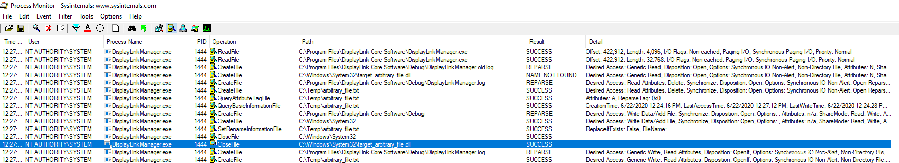 PS C:SymlinkTestTools> .CreateSymlink.exe -p "C:Program FilesDisplayLink Core SoftwareDebugDisplayLinkManager.old.log" "C:WindowsSystem32target_arbitrary_file.dll"