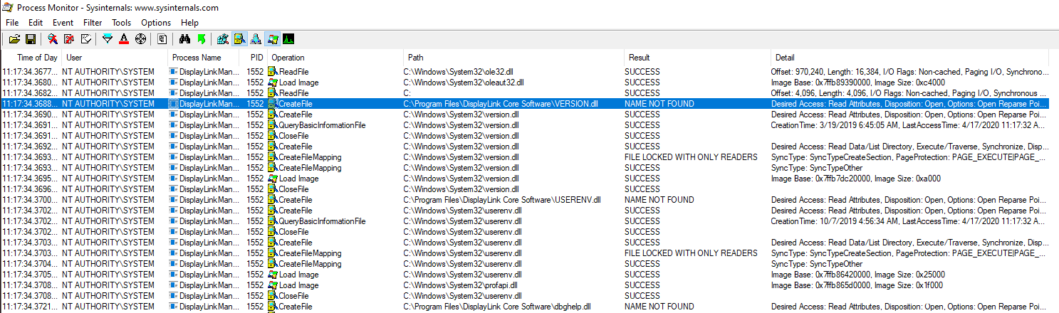 因此,我们启动ProcMon,搜索DisplayLink Manager未成功加载的DLL: