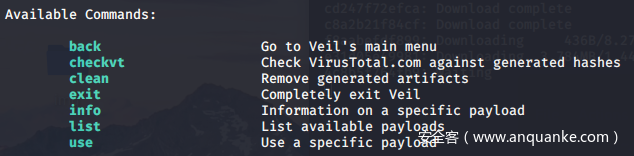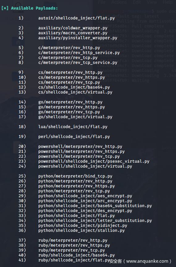 Veil的Evasion一共包含了41中Payload,其中包括autoit的shellcode注入、meterpreter后门、cs后门、golang版本的meterpreter后门、lua的shellcode注入、perl的shellcode注入、Powershell版本的meterpreter后门、python版