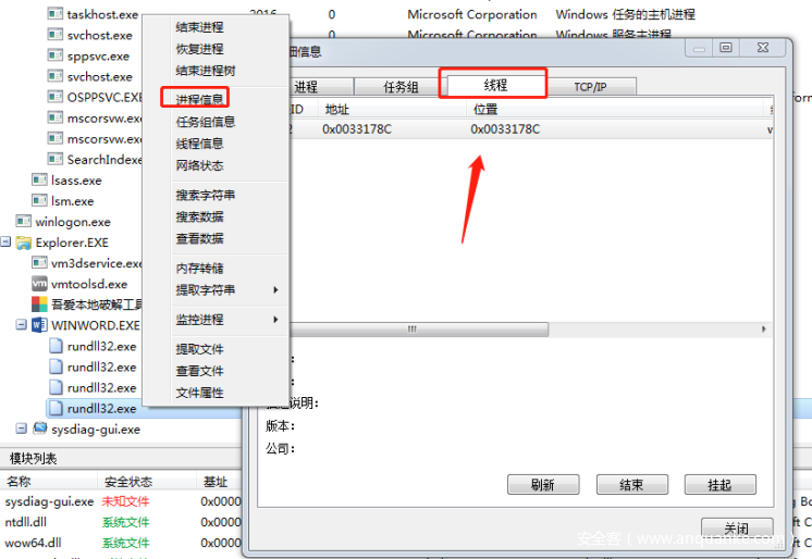 获取到写入的地址之后,可以直接在火绒剑里面右键,查看进程信息,转到线程,双击之后,在内存查看窗口中输入转换后的十六进制地址:d0000查看内存