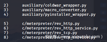 回到Veil框架中来,刚才在生成autoit的样本时候,Veil提供了五个选项用于生成不同的shellcode,上面经过试验可知Veil默认的shellcode和CobaltStrike中对应,接下来看看MSFvenom选项的shellcode。