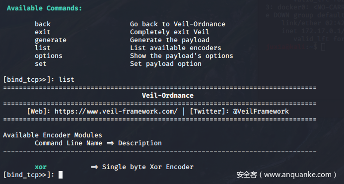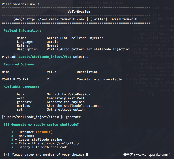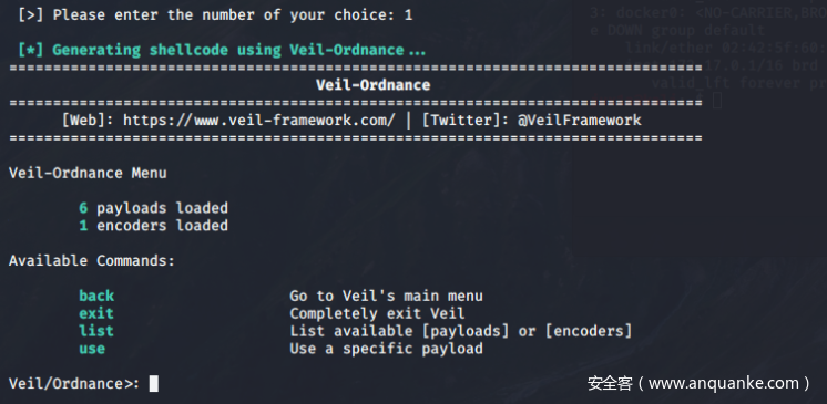 Veil主要是包含了Evasion和Ordnance两个免杀工具,其中Evasion是用作文件免杀,Ordnance可生成一段Veil的Shellcode。接下来将以一个简单的例子讲述Veil框架的样本生成:
