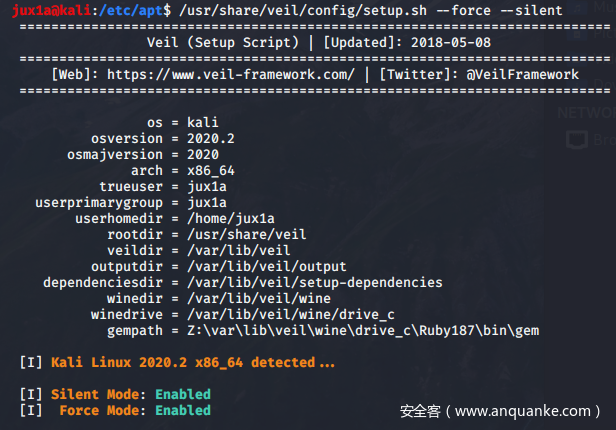 在kali中安装Veil只需要在确保配置的源可用的情况下执行apt -y install veil 即可快速安装
