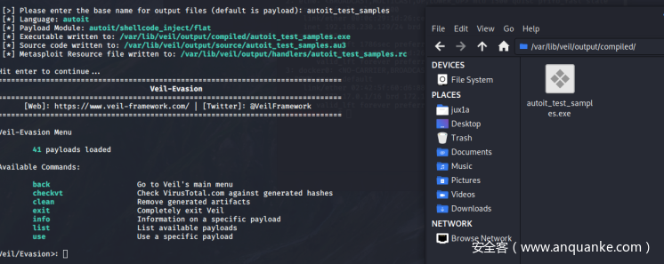 配置完成之后,生成payload的时候,Veil会自动创建源代码文件和可执行文件,分别放入compiled文件夹和source文件夹中。