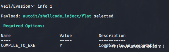 根据回显信息可知,autoit的Payload可直接编译成可执行文件。所以键入use 1 生成一个autoit的Payload试试