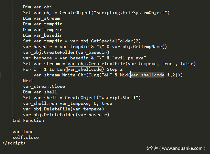脚本会在末尾将shellcode写入到evil_pe.exe中并通过Wscript.Shell加载执行