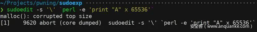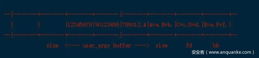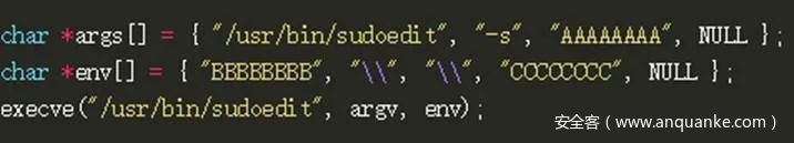 其次,控制溢出区域的内容。可以通过使用提供的环境变量来实现。环境变量实际上存储在最后一个参数传递给sudoedit之后,这意味着如果我们执行env -i’A =BBBB’sudoedit -s’CCCCCCCCCCCCCCCC’,我们会将C插入到user_args缓冲区中,而A = BBBB将紧随其后插入到边界区域。请注意,块大小应与0x10大小保持一致,例如env -i’A = BB’sudoedit-s’CCCCBBBBBBBB’仅填充缓冲区。