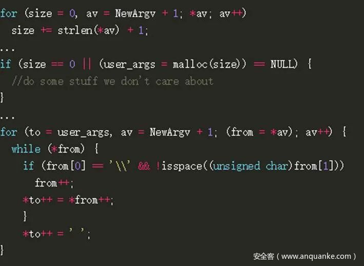 第一个for循环中,正在遍历每个参数,并使用strlen判断其大小(加上空终止符),现在我们假设有空字符串“AAAA\”(\是一个字符),大小为5,并且加上这是唯一的参数,仅分配5个字节。