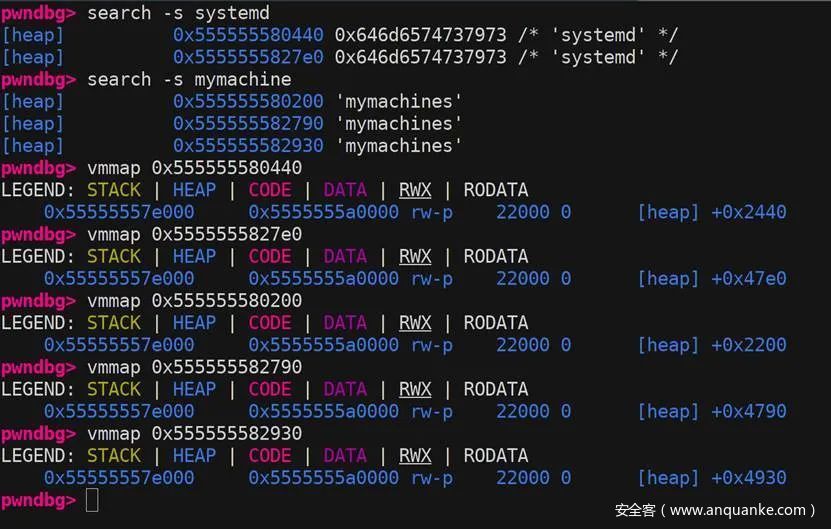 在这里,我service_user在内存中显示了不同的名称,并在vmmaps下面显示了相同的名称。如图所示,第二个vmmap对应于systemd,其偏移量为距堆基0x47e0。这显然是一个问题,因为我们service_user在列表0x4790之前的列表中看到了另一个,而两个结构之间只有0x50的空间,所以两个结构之间只有0的空间。这使得不可能针对这一目标,但是我们可以只选择之前的目标。但是,为什么不针对其他一些fx某些0x2000结构呢?好吧……您根本无法进行那么早的分配。