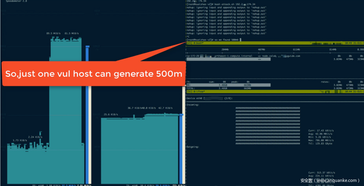 我们随机选择一台可利用主机,进行实际测试,目标为我们自己的AWS ec2,发现在实际情况中,单台反射流量达到了700m/s,稳定500m/s,通过之前的研究,全网可利用主机数量在5万以上量级。