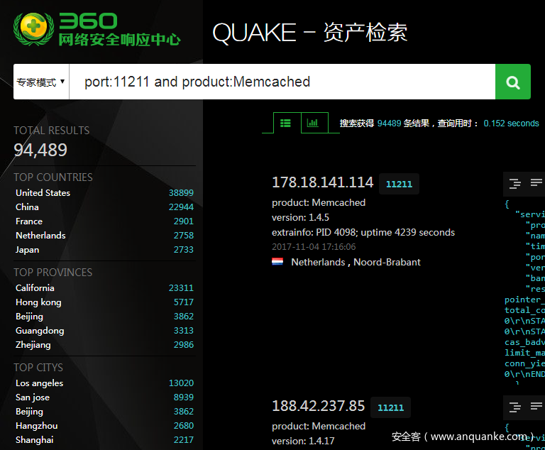 通过360CERT QUAKE全网测绘显示,在外开放的Memcache存储系统有94489,在十万量级上下